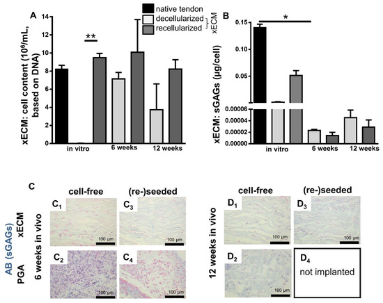 The GAG content was monitored quantitatively using the DMMB assay. It was only examined in the xECM since the explanted PGA samples became too small to perform this analysis. The GAG content in recellularized xECM in vitro was higher compared with the cell-free xECM, but it was still lower compared with native tendon (Figure 6B). Interestingly, the GAG content of recellularized samples was significantly lower after six weeks of in vivo incubation compared with the in vitro cultured recellularized samples and native tendons. It showed a slight increase after 12 weeks in vivo compared to six weeks. However, no major difference existed between cell-free and reseeded constructs in vivo at the six- and 12-week observation time points (Figure 6B).