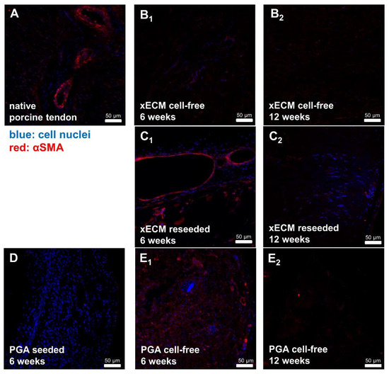 αSMA containing blood vessels could be detected in native tendons (epitenon region) and in the capsule region of recellularized and cell-free implanted xECM and PGA samples explanted from the nude mice after six and 12 weeks. This observation indicated that blood vessel accessed the implants (Figure 7).