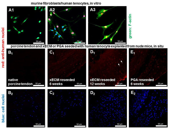 Detection of human cell nuclei recellularized xECM in vivo six and 12 weeks after implantation in the nude mice. (A1–3) Human hamstring tenocytes and the murine subcutaneous fibroblast cell line (L929) were immunolabeled for human cell nuclei (48 h of culture). (A1) L929, (A2) co-culture consisting of L929 and human tendon fibroblasts and (A3) human tendon fibroblasts. (A1–A3) Green, Phalloidin-Alexa488 staining of F-actin cytoskeleton. (A1–E1) Anti-human cell nuclei immunolabeling (red) to mark human-derived cell nuclei. (A1–3,B2–E2) DAPI staining to show all cell nuclei. (B1–2) Native porcine AS tendon, (C,D) xECM decellularized and recellularized with human tenocytes and implanted in nude mice for six (C) and 12 weeks (D), immunolabeled for anti-human nuclei and Cy3-coupled secondary antibody. D1: arrows mark cell nuclei (red) of human cells. (E1–2) PGA recellularized for six weeks.