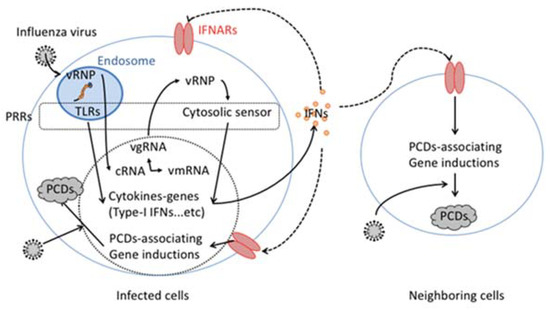 In response to influenza virus infection and replication, the induction of PCD is triggered in a host cytokine-dependent manner (Figure 1) [12,13]. The influenza virus particles bind to sialic acid on the host cell surface via their surface molecules HA and NA. In the influenza virus infection stage, the viral particles are enzymatically resolved in the endosome of the cells. At this stage, vgRNAs released from the viral particles stimulate pattern recognition receptors (PRRs) including toll like receptors (TLRs), which localize on the endosomal plasma membrane [14,15]. The stimulated TLRs activate intracellular signals to induce gene expression of several cytokines and intracellular molecules.