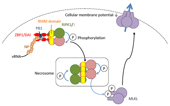 Molecularly-defined necroptosis induction in influenza virus infection. The complex of vRNA and nucleoprotein (NP) and polymerase basic protein 1 (PB1) of the influenza virus is recognized by the Z-DNA-binding protein 1/DNA-dependent activator of IFN-regulatory factors (ZBP1/DAI). The ZBP1/DAI induces oligomerization of receptor-interacting kinase (RIPK)1/3. Within the oligomeric kinase complex (namely, the necrosome), each RIPK phosphorylates and activates together. The activated RIPKs phosphorylate and activate mixed lineage kinase domain-like (MLKL). The phosphorylated MLKL translocates from the cytosol to the cellular membrane. The translocated MLKLs form a cellular channel to permeabilize the cellular membrane.