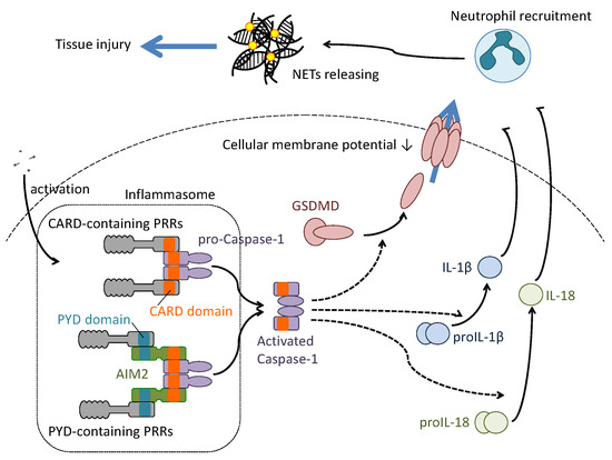In cells infected with intracellular microbial pathogens, several microbial components are recognized by cytosolic PRRs, which conserve a caspase activation and recruitment domain (CARD) or a pyrin domain (PYD), such as NOD-like receptor proteins (NLRPs), absent in melanoma (AIM) and pyrin. The CARD-containing PRRs (NLRP1 and NLRC4) directly recruit pro-caspase-1 to their CARDs for aggregation and form inflammasomes to activate caspase-1. Recruitment of apoptosis-associated speck-like protein containing CARD (ASC) is required for formation of inflammasome of PYD-containing PRRs (neuronal apoptosis inhibitory protein (NAIP), MHC class II transcription activator (CIITA), incompatibility locus protein from Podospora anserina (HET-E) and telomerase-associated protein (TP1) (NACHT), leucine-rich repeats (LRR) and PYD domains-containing protein 3 (NLRP3)) and PRR-adaptor protein to take place. The activated caspase-1 cleaves and converts pro-IL-1β and pro-IL-18 into their mature forms.