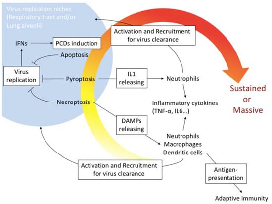 PCD induction in host protective immunity and pathogenicity in influenza virus infection. PCDs including apoptosis, necroptosis and pyroptosis are usually mechanisms to limit influenza virus proliferation niches. Especially, necroptosis and pyroptosis associate releasing DAMPs or IL1 that activate and recruit phagocytotic cells such as neutrophils, macrophages and dendritic cells into local virus replication area. The phagocytotic cells produce several inflammatory cytokines including TNFα and IL-6 to promote the accumulation of the cells. High yield of the virus replication often promotes and/or sustains the massive host immunoreactions that cause tissue damages and organ failure.