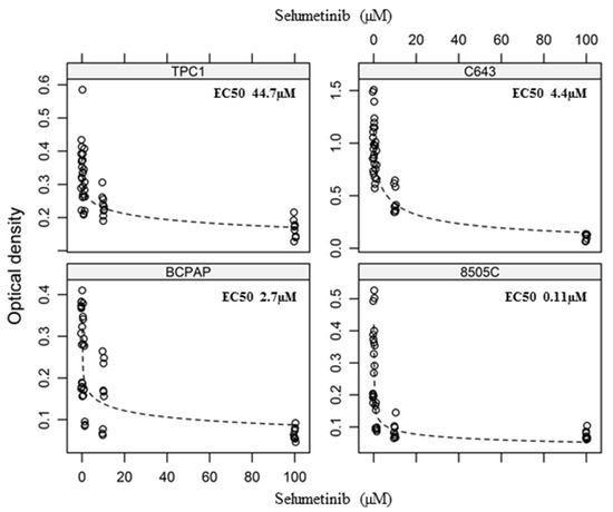 From two cell lines carrying wild type BRAF, the cell line C643 was as sensitive as BCPAP. This result is in line with the observation of Liu et al., who found C643 cells harbouring an HRAS (GTPase HRAS; transformin protein p21) mutation that confers sensitivity to MEK inhibitors similar to those cells with mutated BRAF [31]. TPC1 cells were less sensitive to selumetinib administration. Presumably, this is due to the fact that these cells harbour a Ret/PTC1 rearrangement that confers a resistance to the anti-proliferative effects exerted by MEK inhibition to these cells [31]. Our study furthermore confirmed the inhibitory effect on MEK exerted by selumetinib, as was previously published [26,32]. Selumetinib is currently used in therapy of patients affected by solid cancer, and it has shown a high affinity in patients suffering from non-small cell lung cancer (NSCLC) [33], melanoma [34] and breast cancer [35]. Additionally, in vitro studies have shown that selumetinib is capable of blocking cell proliferation and metastasis in several solid cancer models [36,37,38].