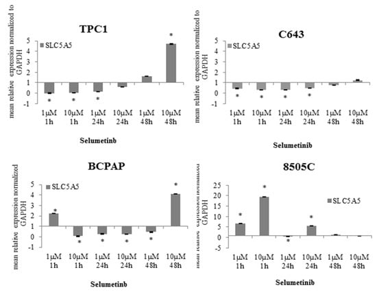 SLC5A5 (sodium iodide symporter (NIS)) expression affected by selumetinib. RT-qPCR of SLC5A5 transcript in TPC1, C643, BCPAP and 8505C cells treated with 1 and 10 µM selumetinib. SLC5A5 transcript was normalized to GAPDH (Glyceraldehyde 3-Phosphate Dehydrogenase). Results are expressed relative to the untreated control. Data represent mean ± SEM of experiments performed in triplicates. * p < 0.05 regarded as significant.