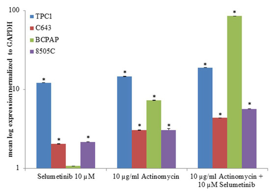 To better understand the modality of action of selumetinib, TPC1, C643, BCPAP and 8505C cells were pre-treated for one hour with 10 µg/mL actinomycin, a potent transcription inhibitor, and then incubated with 10 µM selumetinib for 48 h.