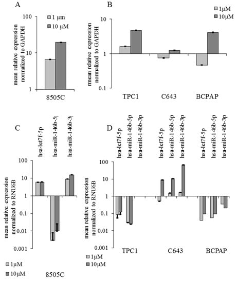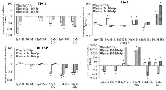 MiRNA expression affected by selumetinib. RT-qPCR of hsa-let7f-5p, hsa-miR-146b-5p and, hsa-miR-146b-5p in TPC1, C643, BCPAP and 8505C cells treated for 48 h with 1 and 10 µM selumetinib. MiRNA transcripts were normalized to RNU6B. Results are expressed relative to the untreated control. Data represent mean ± SEM of experiments performed in triplicates. * p < 0.05 regarded as significant.