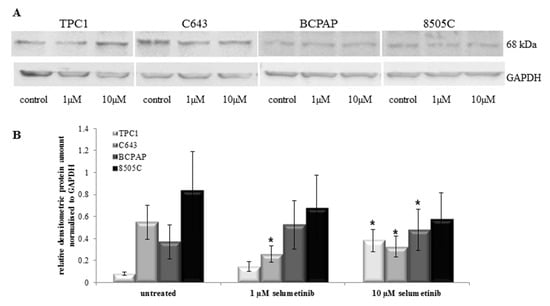 In particular, 10 µM selumetinib caused a significant over-expression of NIS protein in TPC1 cells, confirmed by densitometric analysis (Figure 7B). NIS over-expression was observed in BCPAP also, especially after treatment with 10 µM selumetinib. C643 and 8505C cells showed a decrease of NIS protein after treatment with 1 and 10 µM selumetinib. The down-regulation was significant in C643 only (Figure 7A,B).