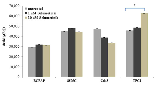 As shown in Figure 8, 10 µM selumetinib caused a significant increase of the radioiodine uptake in TPC1 cells, whereas in BCPAP and 8505C cells the activity was almost stable or not significantly up-regulated. C643 cells were characterized by a reduction of radioiodine uptake.