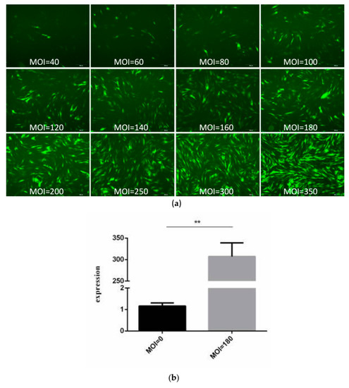 Figure 1. Determination of recombinant adenovirus multiplicity of infection (MOI) value. (a) Different MOI values 72 h after Rybp adenovirus (pAd-Rybp) infection of bovine myoblast (40× magnification); (b) the expression of the Rybp gene in myoblasts with 0 and 180 MOI of pAd-Rybp. (** p < 0.01).