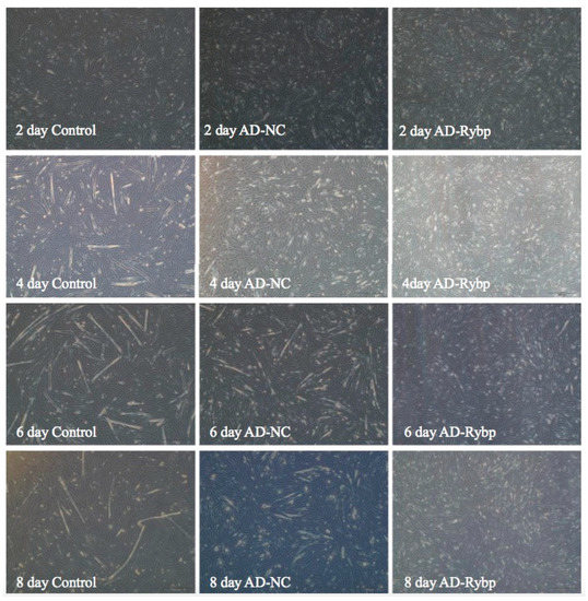 Figure 2. The morphologic changes of myoblasts at different differentiation times (2 days, 4 days, 6 days, and 8 days) after overexpressing the Rybp gene (40×). Note: the differences in myoblast fusion were visible after 4 days of treatment; the AD-Rybp cells were poorly fused (fewer and shorter myotubes) compared to cells with added negative control adenoviruses (AD-NC) or the control group.