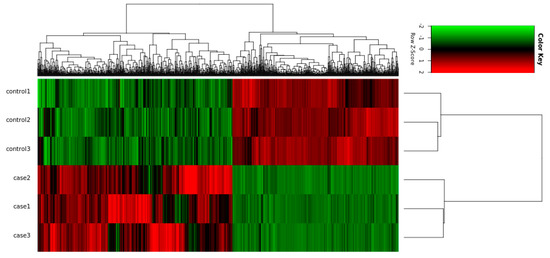Figure 3. Heatmap for the hierarchical cluster analysis of differentially expressed genes (DEGs) between samples. Control1–3 is to add the recombinant adenovirus AD-NC sample; Case1–3 is to add the recombinant adenovirus AD-Rybp sample. Red represents upregulated genes and green represents downregulated genes.