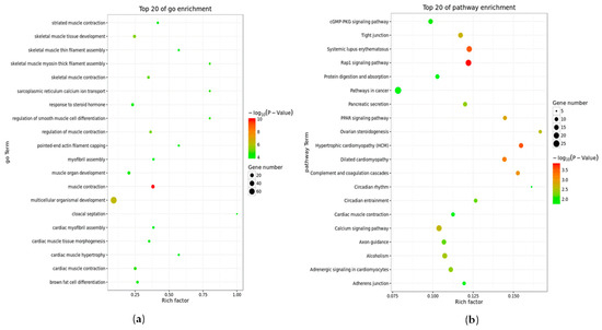According to the KEGG analysis, the top 20 significant pathways involving DEGs include the PPAR signaling pathway and hypertrophic cardiomyopathy, dilated cardiomyopathy, and the calcium signaling pathway, all of which are related to muscle development. Some downregulated DEGs were enriched in the PPAR signaling pathway, the calcium signaling pathway, and the Wnt signaling pathway. In the pathway network, the relationship between signaling pathways is complex. The Wnt pathway, adherens junction pathway, and Ca signaling pathway have strong relationships with muscle tissue development, especially the Wnt signaling pathway. Muscle development and myogenesis are regulated by a series of signaling pathways, and normal muscle differentiation involves the expression of MRF family members, such as MYF5, MYOD, MYOG, and PAX3/7. Research shows that in the stages of prenatal and postnatal muscle development, the Wnt ligand regulates the expression of MRF family members to activate the signaling pathway that regulates muscle growth and myogenesis and the formation of multinucleated myotubes [38]. While the Wnt signaling pathway was in a reduced state in the signal pathway network, we speculate that the overexpression of the Rybp gene can downregulate the Wnt signaling pathway to inhibit the expression of MRF family members, so that differentiation of myoblasts into myotubes is inhibited. Some functional genes can increase the body measurement traits (BMTs) of beef cattle and accelerate breeding efforts related to these traits for Qinchuan cattle breed improvement [39]. For example, Wei et al. [40] found that the gene SIX1 not only mediates skeletal muscle growth by regulating the myogenic regulatory factors MYOD and myogenin, but also improves meat quality. In our study, the Rybp gene was shown to be closely related to muscle development, and we speculate that the inhibition of muscle growth by the Rybp gene can be applied for achieving the goal of accelerating the growth rate and improving the yield and quality of beef cattle through genetic engineering techniques.