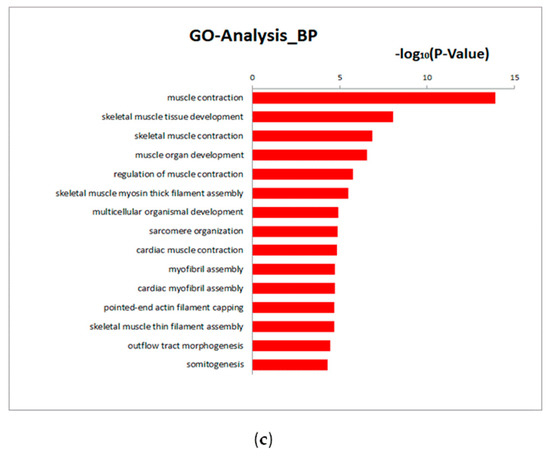 Figure 4. Gene ontology (GO) and pathway analysis of DEGs. (a) Top 20 significant GO terms (biological processes) associated with the identified DEGs. The vertical axis represents the GO category, and the horizontal axis represents the −log2 (p-value) of the significant GO terms; (b) Top 20 significant pathways involving DEGs. The vertical axis represents the pathway category, and the horizontal axis represents the −log2 (p-value) of the significant pathways. Greater −log2 (p-value) scores are correlated with increased statistical significance; (c) Top 15 significant GO terms (biological processes) associated with the identified downregulated DEGs.