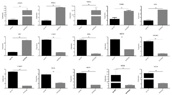 Figure 5. qRT-PCR validation of relative expression levels of representative DEGs. The measured RNA expression levels were normalized by GAPDH. Average values of three replicates are given with the mean ± SD (n = 3) (** p < 0.01).