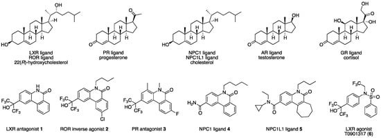 Nuclear receptors (NRs) are ligand-dependent transcription factors that regulate DNA transcription by binding small molecular agonists such as hormones. Forty-eight structurally conserved kinds of NRs have been identified, and many of them recognize endogenous steroidal ligands (Figure 1). Because NRs control diverse biological functions including reproduction, differentiation, homeostasis, and the immune system, they were the targets of approximately 5% of FDA-approved drugs in 2011 [1]. However, not only a steroidal ligand, but also its metabolites, brings with it the potential to cross-react with other nuclear receptors, which can result in unwanted side effects, potentially limiting the clinical utility of these agents. Therefore, surrogates for the steroid skeleton are required to develop selective non-steroidal NR ligands for clinical use [2].