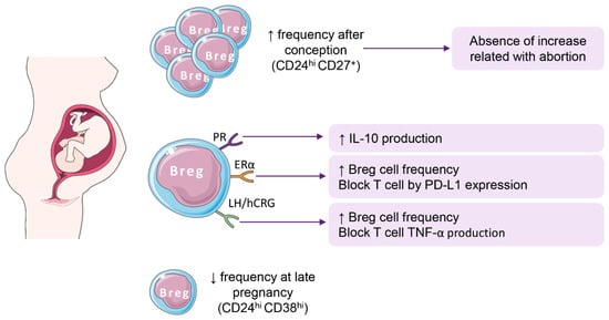 Breg cells in pregnancy. Breg cells are modulated throughout pregnancy, with a major role in pregnancy establishment. Pregnancy-related hormones play a major role in regulating Breg cell frequency and functions. PR: progesterone receptor, ER: estrogen receptor; LH/hCRG: human chorionic gonadotropin receptor.