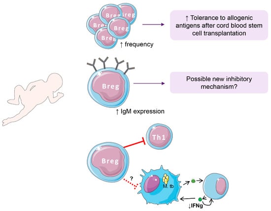 Breg cells in the neonate. Breg cell frequency is increased in neonates, providing improved tolerance to allogenic antigens (i.e., after cord blood stem cell transplantation). Besides, there is a remarkable increase of IgM expression, which may be a new inhibitory mechanism of Bregs in neonates. Finally, Breg cells inhibit Th1 cell responses, which may be related to the reported low interferon (IFN)-γ production after mycobacterial challenge. M. tb: Mycobacterium tuberculosis, Th1: T helper 1.