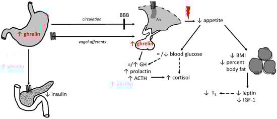 mechanisms contributing to insufficient stimulation of food intake irrespective of high ghrelin levels; = no alteration; ↑ increase/stimulation; ↓ decrease/inhibition, - - > indirect effect; ACTH, adrenocorticotropic hormone; BBB, brain-blood barrier; BMI, body mass index; GH, growth hormone; IGF-1, insulin-like growth factor-1; T3, triiodothyronine.