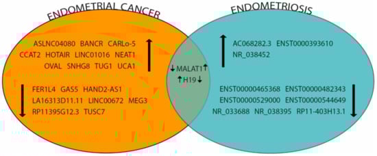 - Smolle, M.A.; Bullock, M.D.; Ling, H.; Pichler, M.; Haybaeck, J. Long Non-Coding RNAs in Endometrial Carcinoma. Int. J. Mol. Sci. 2015, 16, 26463–26472. [Google Scholar] [CrossRef] [PubMed]