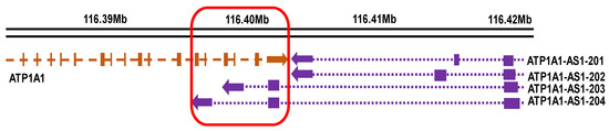 The ATP1A1 antisense RNA (ATP1A1-AS1) is a natural antisense gene of Na/K-ATPase α1, ATP1A1. The transcription of this antisense gene was first reported in a human genomic study [13], which expresses at least four splice variants (ATP1A1-AS1-201, ATP1A1-AS1-202, ATP1A1-AS1-203, and ATP1A1-AS1-204). The sequence of ATP1A1-AS1-203 and ATP1A1-AS1-204 transcripts are partially complementary to the mRNA of sense ATP1A1 gene. At least 27 human tissues, including kidney, heart, and blood, were demonstrated to express the ATP1A1-AS1 RNA transcripts [14,15].