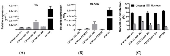 The ATP1A1-AS1 gene is located in the region of 116,392,247–116,418,622 on the reverse strand of human chromosome 1 (Figure 1) based on Ensembl GRCh38.p12 (http://www.ensembl.org). To assess the expression level of each splice variants, we synthesized specific primers corresponding to the four transcripts of ATP1A1-AS1 as described in Material and Method section. As shown in Figure 2A, all 4 splice variants can be detected in human adult kidney cells (HK2 cell line), while the ATP1A1-AS1-203 expression is relatively higher than the other three transcripts. A similar expression pattern was observed in HEK293 cells, a human embryonic kidney cell line (Figure 2B). In both cell lines, the expression level of the antisense transcripts was approximately 5000 times lower than that of ATP1A1. We also examined the subcellular distribution of these antisense transcripts in HK2 cells. A commercial isolation kit was used to extract RNA from the cytosol and nuclear fraction from these cells. The mRNA of Glyceraldehyde 3-phosphate dehydrogenase (GAPDH) was used as a marker of cytosol RNA. As shown in Figure 2C, about 90% GAPDH mRNA was detected in the isolated cytosol fraction—suggesting that the separation of cytosol and nuclear was successful. The expression of ATP1A1-AS1 can be detected in both cytosol and nuclear fraction, but the ratio was much higher in the cytosol fraction.