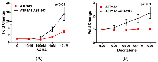 To understand the regulation mechanism of ATP1A1-AS1 expression, we treated HK2 cells with a histone deacetylase (HDAC) inhibitor, suberoylanilide hydroxamic acid (SAHA), at concentrations of 10 nM, 100 nM, 1 μM, and 10 μM for 48 h, and measured the ATP1A1-AS1-203 levels as the representative of ATP1A1-AS1 expression. As shown in Figure 3A, SAHA treatment at lower concentrations (10 and 100 nM) had no significant effect on the expression of the sense or antisense gene expression. However, SAHA at higher concentrations (1 and 10 μM) significantly increased the expression of ATP1A1-AS1-203. It also increased the expression of ATP1A1, but to a lesser degree. We also treated the cells with a DNA methylation inhibitor, Decitabine, at concentrations of 5 nM, 50 nM, 500 nM, and 5 μM for 48 h to test if DNA methylation regulates the ATP1A1-AS1 expression. The result showed that inhibition of DNA methylation had significant effect on upregulating the antisense gene (ATP1A1-AS1) expression, but it did not affect the ATP1A1 gene expression (Figure 3B). These results suggest a differential effect of methylation and acetylation on the regulation of the sense and antisense gene.