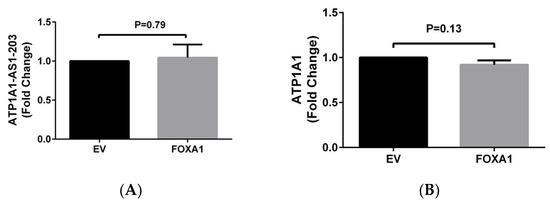 In addition, we also identified a FOXA1 binding site on the upstream of ATP1A1-AS1 gene based on the gene sequence information. To test if FOXA1 regulates the antisense gene expression, we cloned FOXA1 cDNA sequence into a pcDNA3.1(-B) vector and transiently transfected into HK2 cells for 48 h. As shown in Figure 4, overexpression of FOXA1 induced only a slight increase in the expression of ATP1A1-AS1-203 and a slight decrease in the expression of ATP1A1 in these cells, which had no statistical significance.