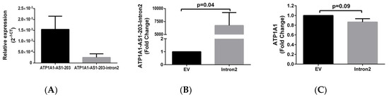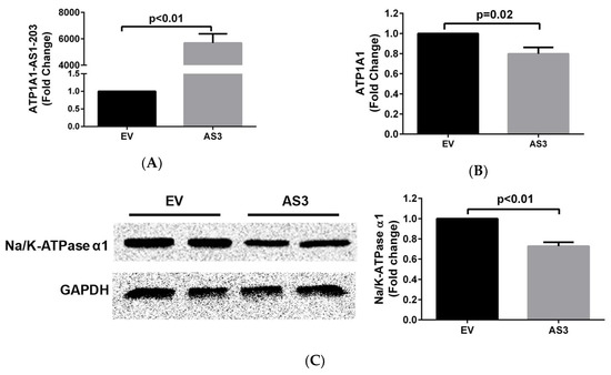 To test the role of ATP1A1-AS1 on the regulation of its sense gene, we constructed a plasmid vector that overexpresses ATP1A1-AS1-203, the highest RNA transcript of the ATP1A1-AS1 gene, and transiently transfected into the cultured HK2 cells for 48 h. We measured the Na/K-ATPase α1 mRNA and protein levels using RT-qPCR and Western blot, respectively. As shown in Figure 5, overexpression of ATP1A1-AS1-203 caused approximately 20% decrease (p < 0.05) in ATP1A1 mRNA levels and 22% decrease in Na/K-ATPase α1 protein levels in these cells, indicating that the antisense gene is a negative regulator of Na/K-ATPase α1.