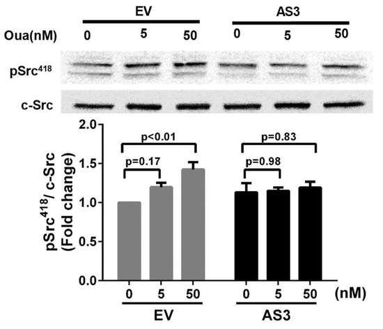 Our previous studies, References [25,30,31], have shown that reduction of Na/K ATPase α1 attenuates cardiotonic steroids (CTS)-induced Src activation and potentiates CTS-induced cell growth inhibition. To examine the effect of ATP1A1-AS1 on the Na/K-ATPase-related signaling function, we transiently transfected HK2 cells with the ATP1A1-AS1-203 overexpression vector for 24 h, followed by ouabain treatment for 15 min. Empty vector transfected cells were used as control. The cell lysate was then collected to probe for Src phosphorylation at tyrosine 418 (pSrc418), an indicator of Src activation. As shown in Figure 7, ouabain treatment at 50 nM induced significant increase in Src phosphorylation in cells transfected with empty vector, whereas in cells that overexpress ATP1A1-AS1-203, ouabain failed to induce the Src activation.