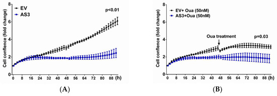 Overexpression of ATP1A1-AS1-203 inhibits HK2 cell growth in presence or absence of ouabain. HK2 cells were transfected with ATP1A1-AS1-203 vector (AS3) or empty vector (EV) for 48 h, followed by treatment of 50 nM ouabain (Oua) for another 48 h. Cells without ouabain treatment was used as control. Cell proliferation was monitored using an Incucyte incubator equipped with a camera that automatically taking pictures every 2 h at 9 different regions of each cell culture well. (A) Cell growth curve in AS3 or EV transfected HK2 cells without ouabain treatment; (B) Cell growth curve in AS3 or EV transfected HK2 cells that treated with 50 nM ouabain. These experiments were repeated four times. Data was analyzed using Two-way ANOVA.