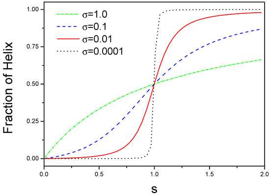 We plot as a function of s for different as shown in Figure 1. There are two limitation cases for -value. For small , a sudden transition can occur for a narrow range of s, this is a helix-coil structural transition. For large , there is a non-cooperative behavior because is equal to for .