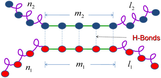 Schematic illustration of the monomer attachment. Two molecules through intermolecular hydrogen bond form a simplistic helix-coil-sheet model. and are the total number of hydrogen bonds for molecule 1 and molecule 2 respectively.