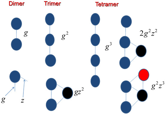 Now we add the third molecule to the dimer to form a trimer. The partition function for this system can be represented as