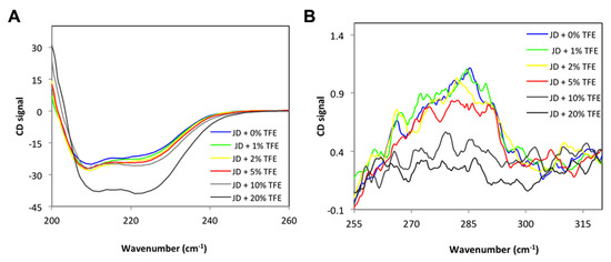 CD spectra of JD at different TFE concentrations (v/v). (A) Far UV CD spectra; (B) near UV CD spectra. All measurements were performed at 25 °C.