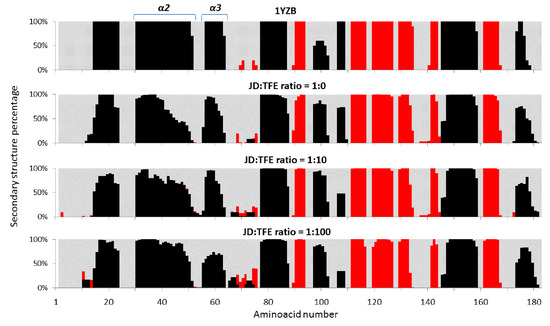 Secondary structure percentage, calculated over the last 20 ns of each MD trajectory at JD:TFE ratios of 1:0, 1:10, 1:100. MD data coming from the simulated trajectories are used as an ensemble for each concentration of TFE. The α-helix (black), beta-sheet (red) and unstructured coil (light grey) are represented.