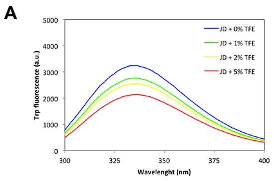 To better understand the effect of TFE on protein tertiary structure, we monitored Trp fluorescence after the addition of co-solvent at 0%, 1%, 2%, 5% concentrations to a solution of 80 µM freshly purified JD. As reported in Figure 5A, there was a concentration-dependent decrease of Trp spectral maxima; however, the maximum did not shift significantly to lower wavelengths, indicating that JD-Trp residues are located in a similar environment. Further characterization of the exposure of hydrophobic clusters to the solvent in the presence of TFE by monitoring the changes in 4,4′-Dianilino-1,1′-Binaphthyl-5,5′-Disulfonic Acid (bisANS) fluorescence confirms that the co-solvent does not promote a significant opening of the globular structure (Figure 5B). Consistent with these results, the one-dimensional NMR (1H-NMR) spectra of the JD in the presence of TFE up to 5% displayed a wide signal dispersion of resonances with good peak sharpness, characteristic of folded molecules (Figure 5C).