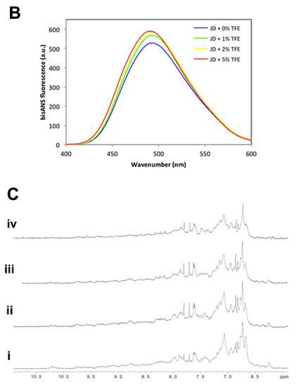 JD spectral properties immediately after TFE addition. (A) Tryptophan intrinsic fluorescence of freshly purified JD in the presence of 0%, 1%, 2% and 5% TFE (v/v); (B) BisANS binding assays of freshly prepared JD after the addition of 0%, 1%, 2% and 5% TFE (v/v); (C) 1H-NMR titration. Spectra recorded in solution containing 0% (i), 1 (ii), 2 (iii) and 5 (iv) % TFE. All the measurements were performed at 25 °C.