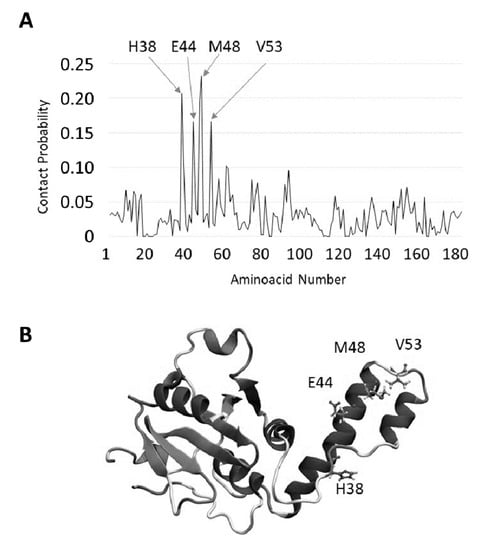 Searching for TFE-interacting residues of JD. (A) Most sampled TFE-JD binding regions identified by contact probability plot; (B) Picture of the most likely involved residues.