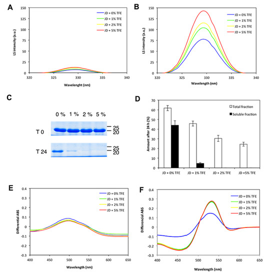 To monitor if TFE influences the intrinsic aggregation propensity of JD, solutions of 80 µM freshly purified JD in the presence of 0%, 1%, 2% and 5% TFE were incubated for 0 and 24 h at 37 °C under static conditions. We first monitored the presence of aggregates in fresh and incubated samples by measuring orthogonal light scattering (Figure 7A,B). A large increase in light scattering signal was observed upon incubation under all conditions: In particular, the amount of aggregates in the solution were directly related to TFE concentration, the higher amount being detected at 5% TFE. An aliquot of each incubated sample was centrifuged to separate the soluble fraction, which was then subjected to SDS-PAGE and densitometric analysis. This revealed that after 24 h, about 44% of protein in the untreated sample was still soluble, but only 5% remained soluble at 1% TFE and none at 2% and 5% TFE (Figure 7C,D).