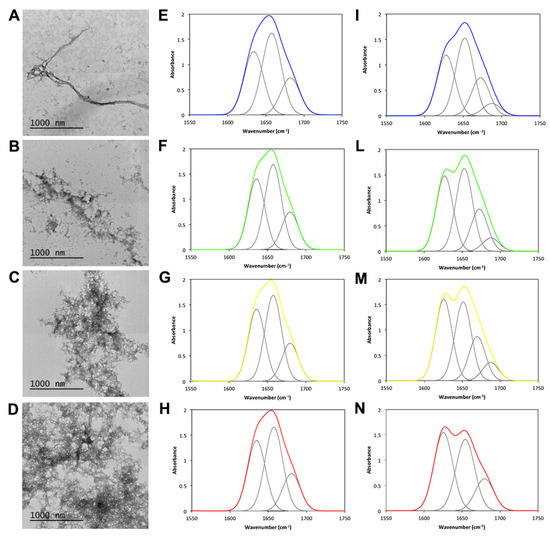 TEM and FTIR analyses of the JD aggregates in the presence of different TFE concentrations. (A–D) TEM images of negatively stained JD aggregates formed after 24 h of incubation at 37 °C in the presence of 0 (A), 1 (B), 2 (C) and 5% (D) TFE (v/v). (E–I,L–N) ATR/FTIR spectra of JD after 0 h (E–H) and 24 h (I,L–N) in the presence of 0%, 1%, 2% and 5% TFE (v/v). All the spectra were acquired in the amide I region and the fitted individual bands after Gaussian deconvolution are shown (grey lines).