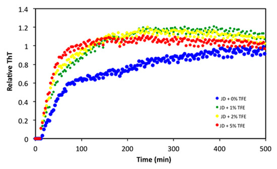 Finally, we assessed whether TFE also affected the protein aggregation rate, irrespective of its impact on the amount of final aggregates. The aggregation kinetics of 40 µM JD in the presence of 0%, 1%, 2% and 5% TFE at 37 °C were recorded by monitoring changes in the fluorescent signal of Thioflavin T (ThT), a dye that increases its fluorescence when it binds to intermolecular β-sheets. As reported in Figure 9, TFE accelerated the aggregation reaction in a concentration-dependent manner.