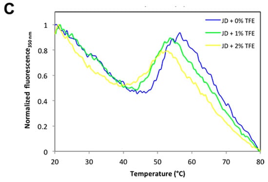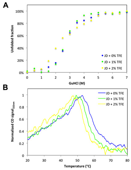 We have shown that concentrations as low as 2% TFE suffice to dramatically increase the aggregation propensity of JD, even though they impact only marginally on its structure. A possibility is that TFE would act by decreasing the conformational stability of the globular domain. Therefore, we analyzed the resistance of JD against chemical denaturation in the presence of 0%, 1%, and 2% TFE. The chemical denaturation curves at equilibrium were followed at 25 °C by monitoring the changes in Trp intrinsic fluorescence at 360 nm (Figure 10A) at increasing guanidinium chloride (GuHCl) concentrations. The JD displayed a single observable transition under all conditions. We could not find any significant destabilization in the presence of TFE, with [GuHCl]50% values of 2.44 M, 2.56 M and 2.35 M in the absence and in the presence of 1% and 2% TFE, respectively. Yet, it can be that this co-solvent might still impact the thermal stability of the protein. We thus monitored JD thermal unfolding by far UV CD at 222 nm and Trp intrinsic fluorescence at 350 nm (Figure 10B,C). We followed the unfolding in the temperature range 20–80 °C, with a heating rate of 1 °C/min. When monitoring far UV signal of JD in PBS, we observed a conformational transition between 45 and 65 °C with a melting temperature (Tm) of approximately 60 °C. TFE promoted a drop in Tm by about 4 °C at 1% TFE and 6 °C at 2% (Figure 10B). When monitoring Trp fluorescence, the main transition in the absence of TFE occurred between 45 and 55 °C, with a Tm of approximately 50 °C. This indicates that the loss of secondary and tertiary structure are uncoupled, the tertiary structure being lost first. Indeed, at 60 °C all the tertiary structure is lost whereas the protein still displays 50% of secondary structure. The presence of 1% or 2% TFE only slightly decreases the Tm, i.e., to about 47 and 45 °C, respectively (Figure 10C). Thus, TFE only marginally affects JD thermal stability. Importantly, aggregation reactions were monitored at 37 °C, a condition that in all cases is paralleled by the pre-transition state. This further confirms that JD is properly folded in the presence of 1% and 2% TFE.