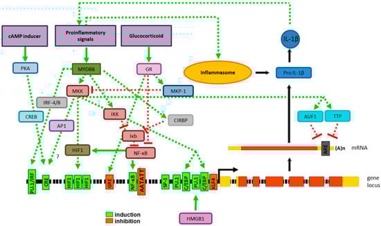 Upstream of the core promoter, a functional nuclear factor kappa-light-chain-enhancer of activated B-cells (NF-κB) binding site was reported to contribute to elevated IL-1β gene expression after stimulation [22]. MyD88 activation resulted in both direct MyD88/IκB kinase (IKK)-dependent degradation of IκB as a prerequisite for the release of NF-κB dimers and stimulation of mitogen activated protein kinase kinase (MKK) activity [23]. MyD88 activation was reported to stimulate cold-inducible RNA binding protein (CIRBP) which in turn down-regulated IκB expression and hence promoted IL-1β expression [24]. Lebedeva and Singh [25] identified a palindromic AT-rich sequence stretch located closely downstream of the NF-κB site to constitutively inhibit IL-1β promoter activity, but could not identify the transcriptional repressor involved. An inducible glucocorticoid response element (GRE) located upstream of the NF-κB site inhibited IL-1β gene expression in response to dexamethasone which activates the TF glucocorticoid repressor (GR) [26]. As another layer of negative IL-1β gene regulation, the activated GR was reported to directly inhibit LPS-induced NF-κB and activator protein-1 (AP-1) on protein level [27]. In addition, GR-induced MKP-1 was shown to repress LPS-induced IL-1β induction via MKK repression by direct protein-protein interaction [28].