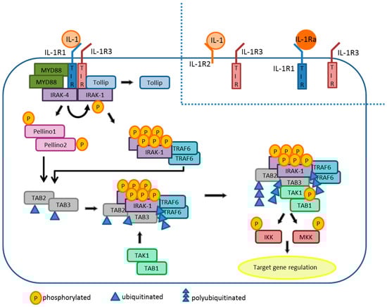 Upon formation of the IL-1R complex, the two intracellular TIR domains of IL-1R1 and IL-1R3 recruit the TIR domain-containing adaptor protein MyD88 [102,103,104,105]. The attracted MyD88 proteins constitue oligomers which form a death domain (DD) important for subsequent signaling [106]. The DD of MyD88 recruits proteins of the IL-1R-associated kinase (IRAK) family. First, IRAK-4 binds to MyD88 followed by IRAK-1 and-2 [107,108], Toll-interacting protein (Tollip) [109] as well as Pellino-1 (PELI-1) and-2. PELI-1 and-2 are E3-ubiquitin ligases [110]. Non-phosphorylated IRAK-1 bound to Tollip is inactive [111]. When IRAK-1 binds to the IL-1R complex, it is phosphorylated and thereby activated through IRAK-4 activity and dissociates from Tollip and from the IL-1R complex [109,112]. IRAK-1 becomes hyper-autophosphorylated due to its activation by IRAK-4. Then, TRAF6 (TNF receptor-associated factor 6) is recruited to hyperphosphorylated IRAK-1 followed by the activation of its E3 ubiquitin ligase activity [113]. At the same time, IRAK-4 phosphorylates and activates PELI-1 and-2 [114,115]. TAK1 binding protein (TAB)2 and TAB3 are ubiquitinated by activated PELI or TRAF6 and recruit the TGFβ1-activated kinase (TAK)1/TAB1 complex [116]. This event results in a conformational change of the complex that leads to autophosphorylation and activation of TAK1 [117,118]. TAK1 phosphorylates and activates downstream kinases such as the MKK or IKK complex which regulate target gene expression [119]. IRAK-2 can replace IRAK-1, but it lacks the autophosphorylation activity of IRAK-1, and is therefore not targeted for fast degradation [120]. Thereby, IRAK-1 is a more stable signaling component of the IL-1 pathway [90].