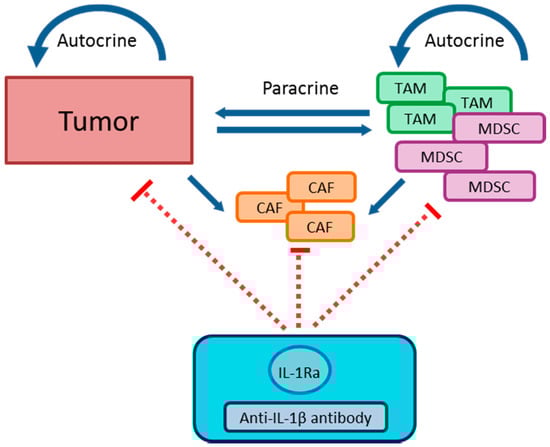 Another key player within the tumor microenvironment is the group of carcinoma-associated fibroblasts (CAF) which contribute to the growth, expansion, and dissemination of cancer cells [251]. CAF originate from the activation of resident fibroblasts or a wide spectrum of other precursor cells such as smooth muscle cells, bone marrow-derived mesenchymal stem cells, epithelial cells, carcinoma cells, and many more [252,253]. CAF activation is triggered by a variety of stimuli, including cancer cell-derived TGF-β1 (tumor growth factor-β1), PDGF (platelet-derived growth factor)α, PDGFβ, basic fibroblast growth factor (bFGF), and IL-6 [254]. CAF contribute to the malignant aggressiveness of tumors through the induction of pro-inflammatory factors including IL-1β, IL-6/8, CCL2, CXCL (C-X-C motif ligand) 1/2/3/12, COX-2, osteopontin (OPN), and intercellular adhesion molecule 1 (ICAM-1) [225,251]. IL-1β was also identified as a stromal-acting chemokine secreted by ovarian cancer cells, suppressing p53 protein expression in CAF. p53 is known to maintain genomic integrity through apoptosis regulation despite DNA damage or instability and also regulates inflammation [255]. Knockdown of p53 expression significantly enhanced the expression and secretion of chemokines IL-1β, IL-6, IL-8, growth regulated oncogene-alpha (GRO-α), and VEGF. In vivo, a significant increase in mouse xenograft ovarian cancer tumor was seen as well [256]. Thereby, epithelial cancer cells use IL-1β as a communication factor to generate a pro-tumorigenic inflammatory microenvironment [256]. Liver metastasis of colorectal cancer is promoted by recruiting circulating CAF to facilitate prophase tumor construction tumorigenicity via an elevated expression of structural maintenance of chromosomes 1A (SMC1A), a subunit of cohesin [257]. Furthermore, it was demonstrated that signaling mediated by the G protein estrogen receptor (GPER) cells, induced by estrogen, triggered IL-1β and IL-1R1 expression in CAF and in breast cancer cells. Thus, the ligand-activated GPER triggers the Epidermal Growth Factor Receptor (EGFR)/extracellular signal–regulated kinases(ERK)/PKC signaling transduction pathway generating a feed forward loop that couples IL-1β induction by CAF to IL-1R1 expression by cancer cells [258]. This resulted in an up-regulation of IL-1β/IL1R1 target genes such as PTGES (prostaglandin E synthase), COX2, RAGE (receptor for advanced glycation endproducts), and ABCG2 (ATP binding cassette subfamily G member 2). Thereby, regulatory interaction between CAF and the cancer cells induces migration and invasive features in breast cancer cells via alterations of fibroblastoid cytoarchitecture and F-actin reorganization [258].