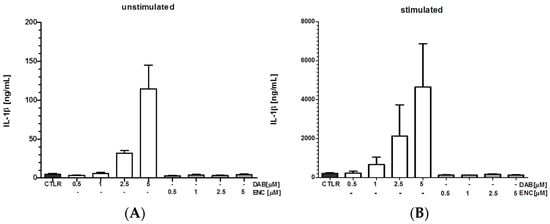 Most recently, we have identified the clinically used B-Raf proto-oncogene, serine/threonine kinase (BRAF)V600E inhibitors (BRAFi) Dabrafenib (DAB) and Vemurafenib (VEM) to simultaneously mediate elevated IL-1β gene expression and inflammasome activation in DC and macrophages as an off target effect [6]. BRAFi are used for the treatment of metastatic melanoma in cases of a mutation in the signaling adaptor BRAF that results in ERK hyperactivation as an oncogenic target. This mutation (BRAFV600E) can be found in about 40% of all melanomas. We observed that DAB strongly upregulated IL-1β production in unstimulated and LPS-stimulated myeloid mouse APC and in unstimulated human primary DC. VEM also enhanced IL-1β secretion by mouse DC and macrophages, but not in human DC. Both BRAFi activated the NLRC4 inflammasome, and DAB additionally induced caspase-8 activation for pro-IL-1β processing. Contrarily, the newly developed BRAFi Encorafenib (ENC) had no effect on IL-1β production (Figure 4). The recently conducted phase III study for applying ENC plus the accordingly applied MEK1/2 inhibitor Binimetinib versus VEM or ENC administered alone showed improved progression-free survival and improved overall response of Encorafenib/Binimetinib treated patients. Treatment with ENC exerted less adverse events such as rash compared to VEM, although the frequency of grade 3 rash was slightly increased [274].
