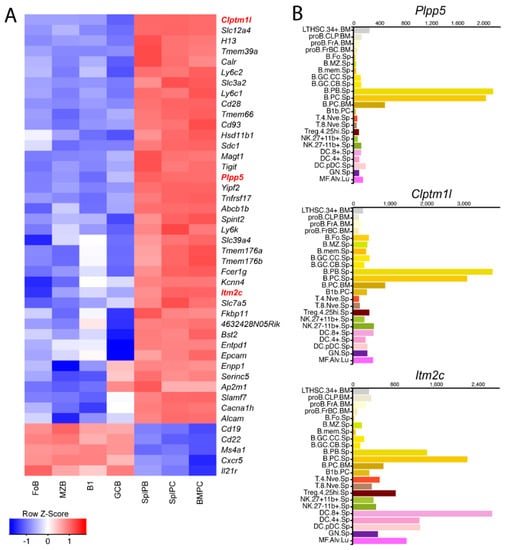 Identification of genes encoding novel surface proteins in mouse ASCs. (A) Expression profiles of genes within the ASC gene signature that encode transmembrane proteins that are either known or predicted to be expressed on the plasma membrane. The expression of five additional genes encoding cell surface proteins expressed in B cells, but not plasma cells is shown for comparison. The positions of Plpp5, Clptm1l and Itm2c are highlighted in red. Expression is represented as a Z-score as defined by the legend; (B) expression of Plpp5, Clptm1l and Itm2c in selected mouse immune cell populations. Data obtained from the Immgen Consortium. Expression value normalized by DEseq2. Immgen nomenclature: BM, bone marrow; Sp, splenic; PC, peritoneal cavity; Lu, lung; LTHSC.34+, CD34+ long-term hematopoietic stem cell; proB.CLP, common lymphoid progenitor; proB.FrA, pre-pro-B cell; proB.FrBC, pro-B cell; B.Fo, Follicular B cell; B.MZ, MZ B cell; B.mem, memory B cell; B.GC.CC, GC centrocyte; B.GC.CB, GC centroblast; B.PB., Plasmablast; B.PC, Plasma cell; T.4.Nve, naïve CD4+ T cell; T.8.Nve, naïve CD8+ T cell; Treg.4.25hi, CD25hi Treg; NK.27+11b−, CD27+ Cd11b− NK cell; DC.8+, CD8+ Dendritic Cell (DC); DC.4+, CD4+ DC; DC.pDC, plasmacytoid DC; GN, neutrophil; MF.Alv, alveolar macrophage.