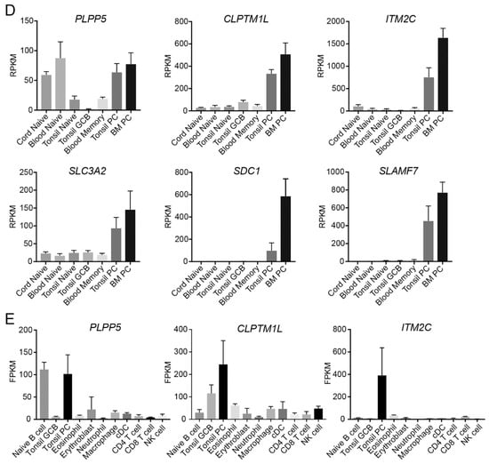 Expression of the human homologues in ASCs. Alignment of mouse and human amino acid sequences for (A) PLPP5, (B) ITM2C, and (C) CLPTM1L. Symbols indicate conserved (I), highly similar (:), and similar (.) residues. (D) RNAseq showing the expression of PLPP5, CLPTM1L, ITM2C and three established clinical candidates SLC3A2, SDC1 and SLAMF7 in purified human B cell and ASC populations. Data are the mean reads per kilobase per million reads (RPKM) ± SD from 3–5 donors each. Cord naïve B cell (CD19+ CD20+ HLA-DR+ IgG−), blood naïve B cell (CD19+ IgD+ CD27−), tonsil naïve B cell (CD19+ CD38− CD27−), tonsil germinal center (GCB) B cell (CD19+ CD38+ CD27+), blood memory B cell (CD19+ IgD− CD27+ CD38−/low), tonsil plasma cell/plasmablast (PC, CD19+ CD27++ CD38++), bone marrow plasma cell (BM PC, CD138++ CD38+). (E) RNAseq showing the expression of PLPP5, CLPTM1L and ITM2C in human immune cell populations. Data obtained from the BLUEPRINT consortium (www.blueprint-epigenome.eu). Data are the mean fragments per kilobase per million reads (FPKM) ± SD. Blood naïve B cell (n = 5, CD19+ CD20+ CD23+ CD38low), tonsil GCB cell (n = 3, CD19+ CD20+ CD38medium), tonsil PC (n = 21, CD20medium CD38++), blood eosinophil (n = 2, CD66+ CD16−), blood erythroblast (n = 8, CD36+ CD71+ CD235a+), blood neutrophil (n = 16, CD66b+ CD16+), cultured macrophages (n = 18) and conventional dendritic cell cDC (n = 3), blood CD4+ T cell (n = 10, CD3+ CD4+ CD45RA+), blood CD8+ T cell (n = 2, CD3+ CD8+ CD45RA+), blood natural killer (NK) cell (n = 4, CD3− CD56+ CD16dim).