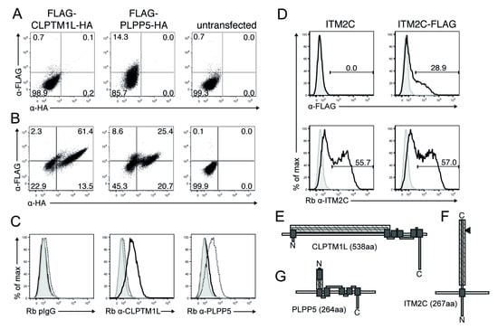 Carboxy-terminal-tagged ITM2C was detected on the cell surface of transiently transfected FS-293F cells by surface staining with a tag-specific antibody and an ITM2C specific antibody (Figure 3D). However, we observed about 30% of tag-positive cells in the tag-specific surface stain, but almost 60% of ITM2C positive cells using the specific antibody. This discrepancy is likely due to protein cleavage of the carboxy-terminal end of ITM2C []. The surface staining of human CLPTM1L and ITM2C fits well with the predicted topology (Figure 3E,F) and a previous study [], demonstrating that these proteins are expressed on the cell surface. The cell surface detection of the N-terminal tag of PLPP5 suggests that the predicted trans-membrane domain at the N-terminal end is not utilized and that a 57 amino acid N-terminal region that contains the polyclonal antibody-binding site is exposed at the cell surface (Figure 3G).